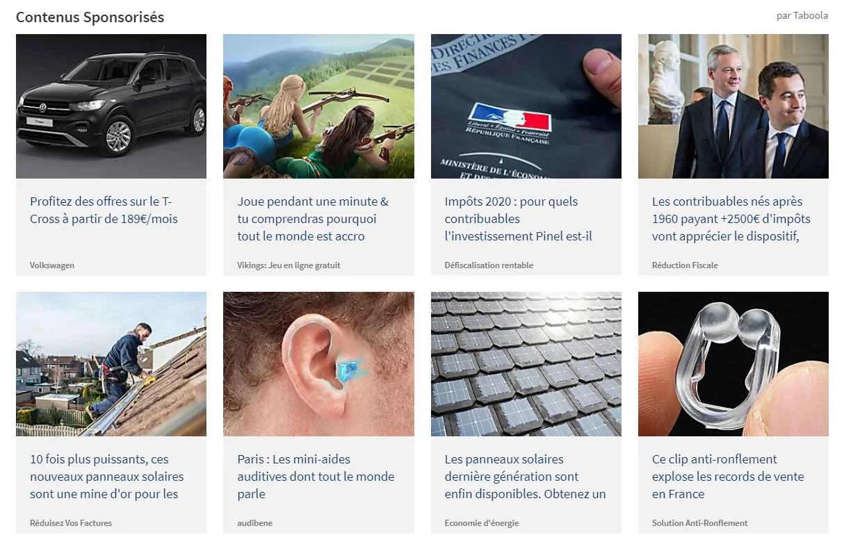 Operational in 50+ countries including France, Taboola is used by media such as Le Figaro, La Dépêche, Challenges, Sciences & Avenir… Exploiting this platform makes it possible to highlight sponsored content and videos, at the beginning or at the end of the article.